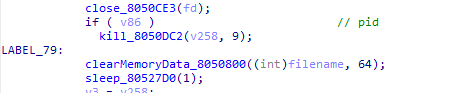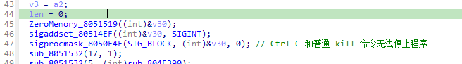 样本(cb0f5b97853a825df1f6155355eb0592)运行后首先调用sigprocmask使模块无法被正常结束。