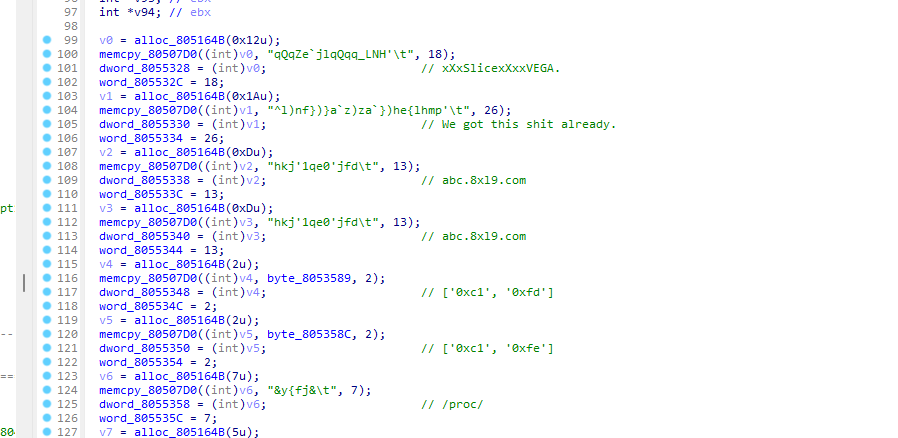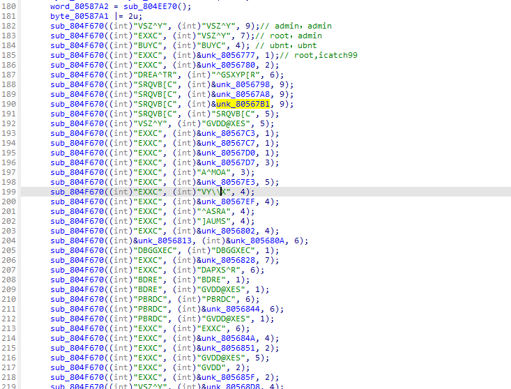 最初7月份的传播中,样本(bbe9c4f1bad3f8f280e600e10f8f7ed1)自身在启动初期会初始化 telnet/SSH 登录凭据表。然后,它通过暴力破解网络设备的弱用户名/密码组合来传播自己。