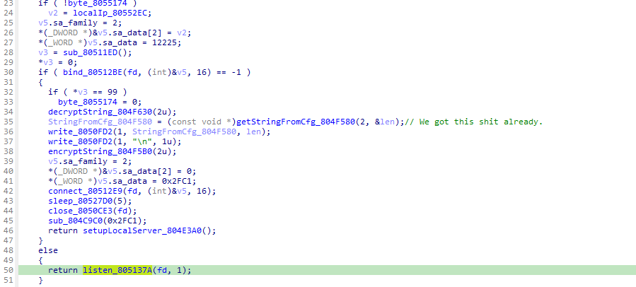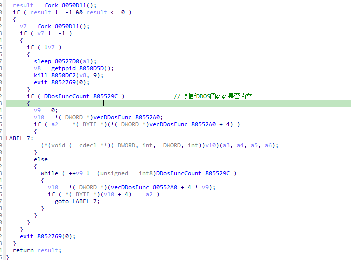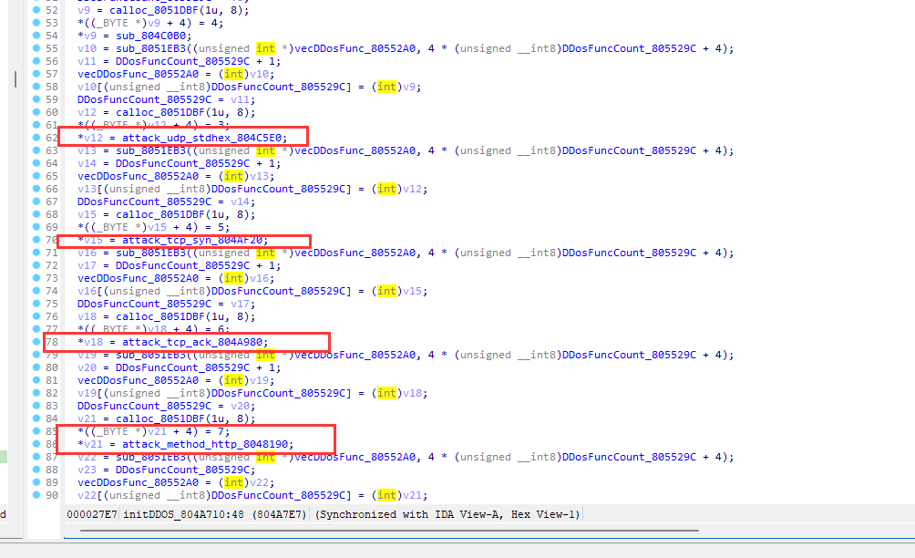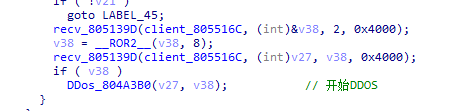 在与C2建立连接之前,样本会先初始化所有的DDoS攻击函数。用来后续接收C2回传的消息后进行DDoS攻击方式选择。