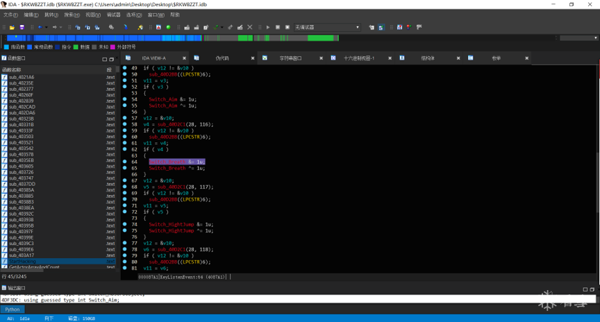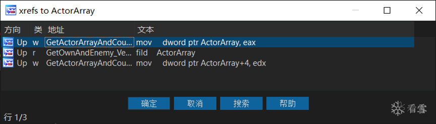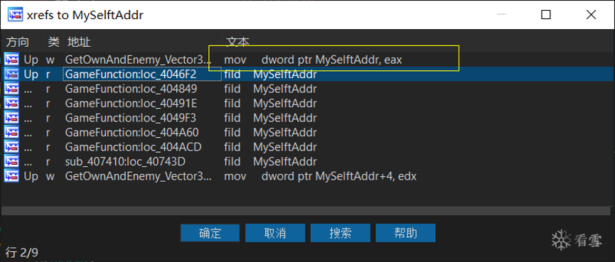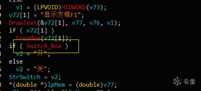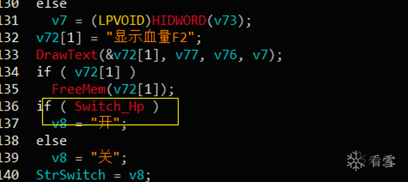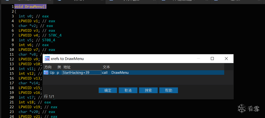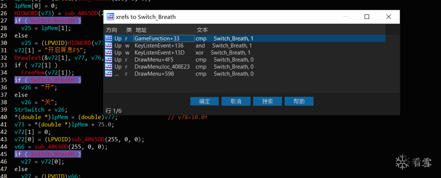 这部分的if只是用来判断和显示功能是否打开,里面并未存在任何其他代码,说明真正的功能开关在别处,而且在功能开启时菜单的内容也有所改变,所以一定会修改到控制变量。我们直接在控制变量上按下X,看看哪里有对他赋值或者判断。(我这用内存屏息作为例子,因为涉及到透视的功能存在算法会稍微复杂)