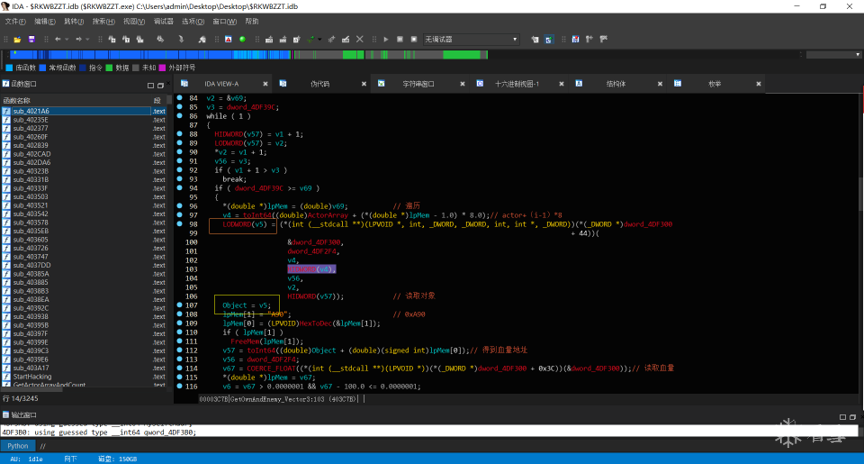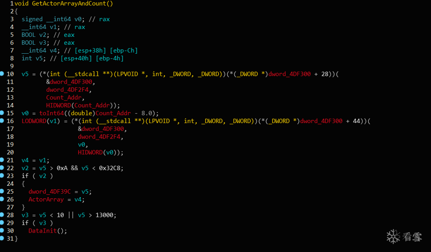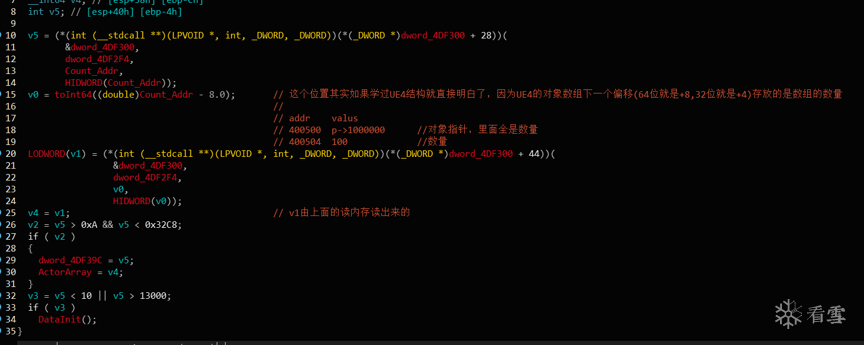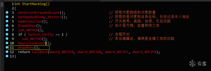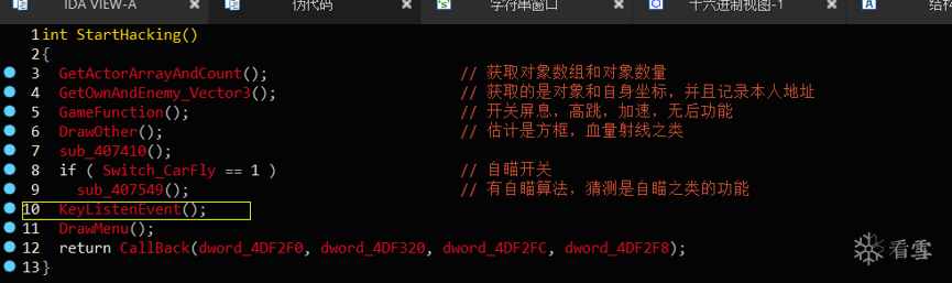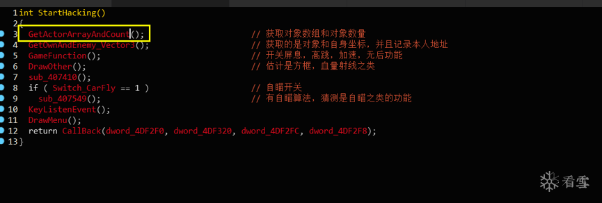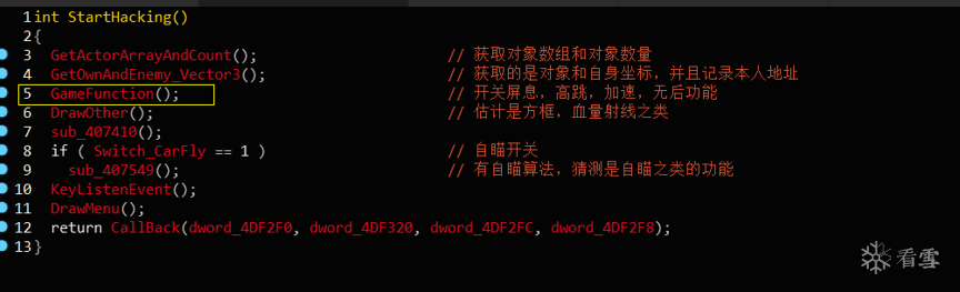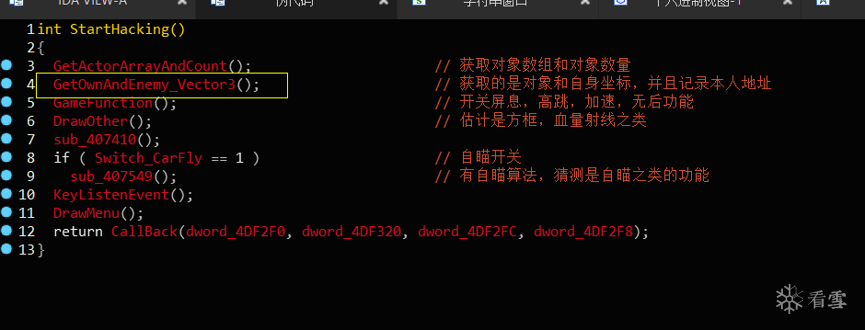 又来到这里,那么这个函数就可以知道他就是去获取游戏的数据,然后给下面模块进行一个加工处理操作。这里基本上就分析完所有模块了,另外几个函数没去分析,因为他里面都是算法,没必要去分析,算法都是通用,网上一大堆。