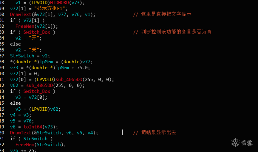 我们通过ida的交叉引用和F5功能来到了这里,我们大概看了一下,这里面都是菜单内容,而且最让人注意的是它每个功能都会有一个变量来判断开和关(和我上面所说的流程一致)。