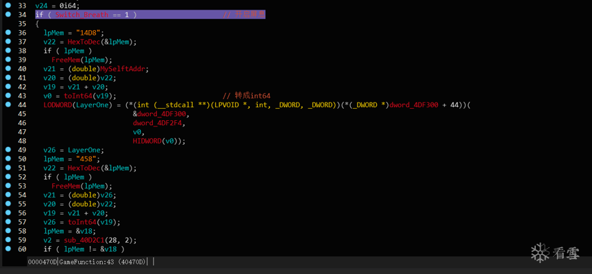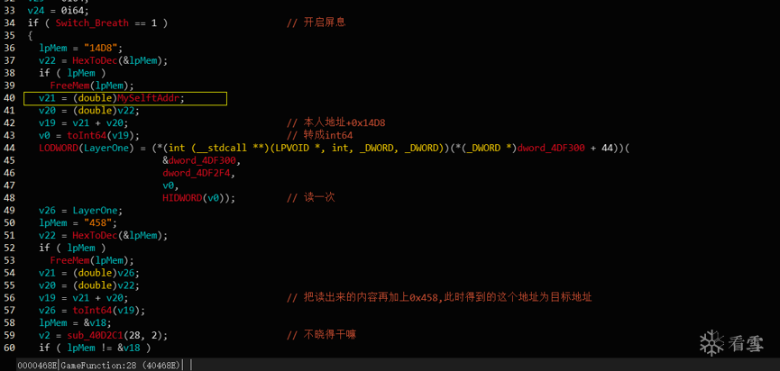 他首先是对14D8这样一个临时进行一个十六进制到十进制的转换,然后对其临时字符串释放(这个也是我在本次逆向分析的时候学到的)。其实他这一句,可能就对应着易语言的进制_十六到十()的这个命令。继续转换之后就开始地址之间的加法,这里也要注意的是,由于程序位32位,游戏为64位,所以指针大小也不同(32位4字节,64位8字节)。Ida这里直接用double计算(一个double 8字节),然后再转为int64也是我这次学到的。最后进行读写操作。这里他是驱动读写,并且在分析的时候发现如果是**+44(十进制)那么就为读操作**,如果是**+64(十进制)就为写操作**。大概了解之后,这个函数的代码基本就可以阅读完了。都是对地址+偏移后读,然后再内容。这里就顺便看一下他的屏息如何实现的。