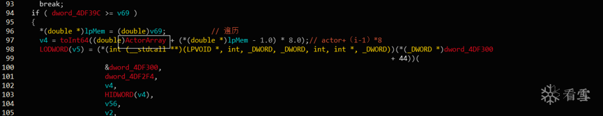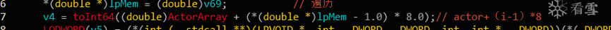 64位一个地址相差刚刚好是0x8。知道这个后,这一段的代码其实已经很清晰,首先去遍历对象数组,然后去判断血量是否>0和<=100,成立的话就是继续判断是否为本人或者敌人,再成立的话,就进行一个本人对象的赋值和读取对象坐标。这里贴分析后注释的代码。