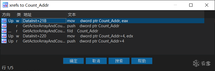 这里只截图了部分代码,但是我们可以看到他这里是在搜索特征码,我们如果再往下分析很难,因为交叉引用显示下面并没有对我们count_addr的地址进行写操作。我们先不管它在干嘛,我们去调试,从IDA返汇编代码记录它的地址,然后我们下断F8单步跟,查看在什么地方他的值被改变了。