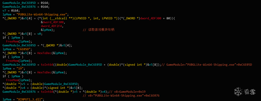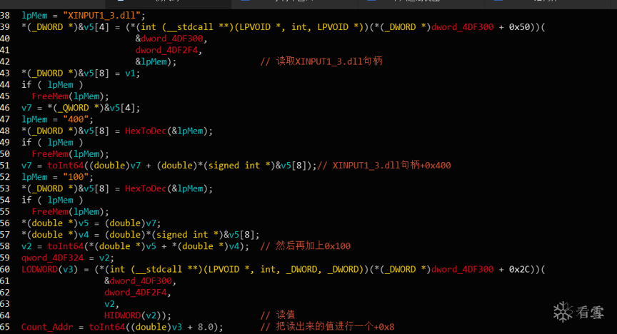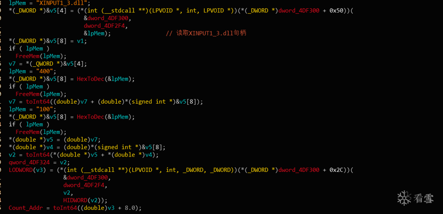 他这一段的骚操作。其实就是读取XINPUT1_3.dll的句柄后加上0x400再加上0x100(我也不知道他为什么不直接+0x500)。然后读取这里面的值。
