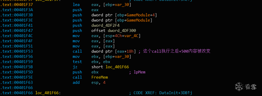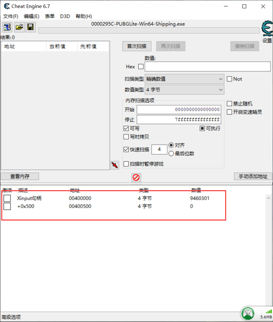 通过CE看了一下,当我们执行完这个call后XINPUT1_3.dll+0x500的位置,里面由0变成了一个地址。说明这个地方,存在着对XINPUT1_3.dll+0x500这个地址的写操作,至于它这一段执行后得到什么值,写了什么值我不带大家去分析,因为这部分代码里的特征码,在我去搜索和对比后,发现其实搜索出来的就是一段对象的解密代码(PUBG lite数据都是加密了的)。