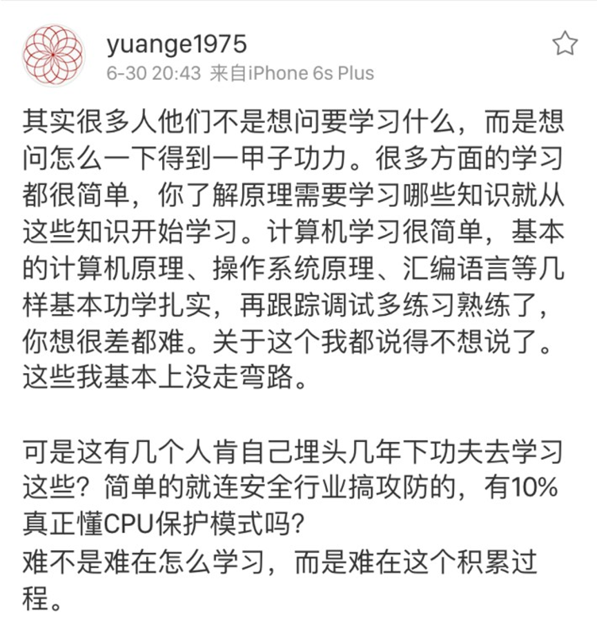 到这里基本上就把程序流程分析完了,可能这里会有人质疑,你就说了这么点就分析完了?其实我的确是分析完了,但是你没去分析,你听别人分析和讲解,觉得自己也行。但是如果给你一个陌生的程序,让你去分析他,可能短短几句功能性的代码都能耗费你几小时时间。逆向这个东西从来不是看谁了解的多,听得多,而是看谁做得多。逆向的确很迷人,能够让你撕开用户和底层那一层隔膜,但是他学习过程和付出的代价却很大,逆向是我目前学习到到现在最能吃经验和积累的一门技术。前段看雪的周年大会,钱老师(钱林松)上台说过最让我震撼的一句话就是:你给我一段反汇编代码,随便给,我一看就马上能知道他的C/C++代码是怎么写的。其实这一句话不假,只要你逆向搞得多,看得多,多多少少也有这种能力,但是说随便给你一段反汇编代码,试问谁能看一下就能直接实现他C/C++代码。这个就是靠积累和经验攒来了。我这篇文章写出来是为了记录我对这个程序的分析过程,写出来大家能不能看懂取决于我的文采行不行,但是在我分析完这个程序后,我反正是对这个程序的整个流程一清二楚,另外我之所以只分析部分是因为其他部分也是一样的,而且我也不可能把整个代码流程全部分析出来,一方面我懒,另一方面啰嗦。最后转一张图片,最近再看雪看到的,也让我很有感触。