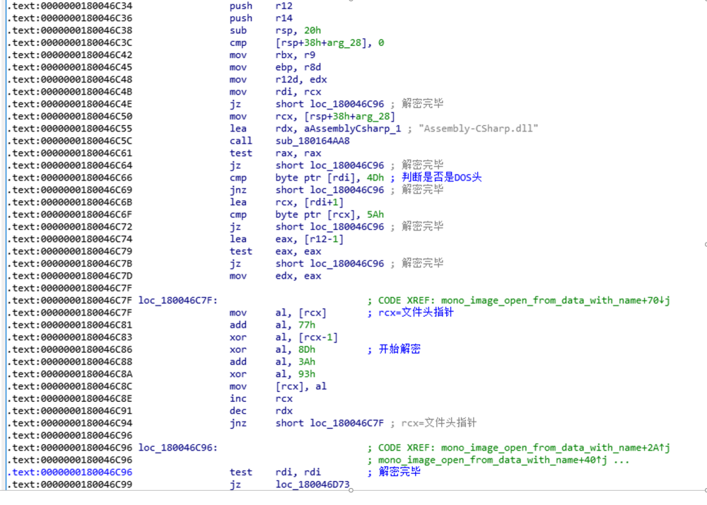 直接在解密完毕的位置下断,然后把rdi给dump出来就行,得到的就是解密后的dll。也可以自写脚本。