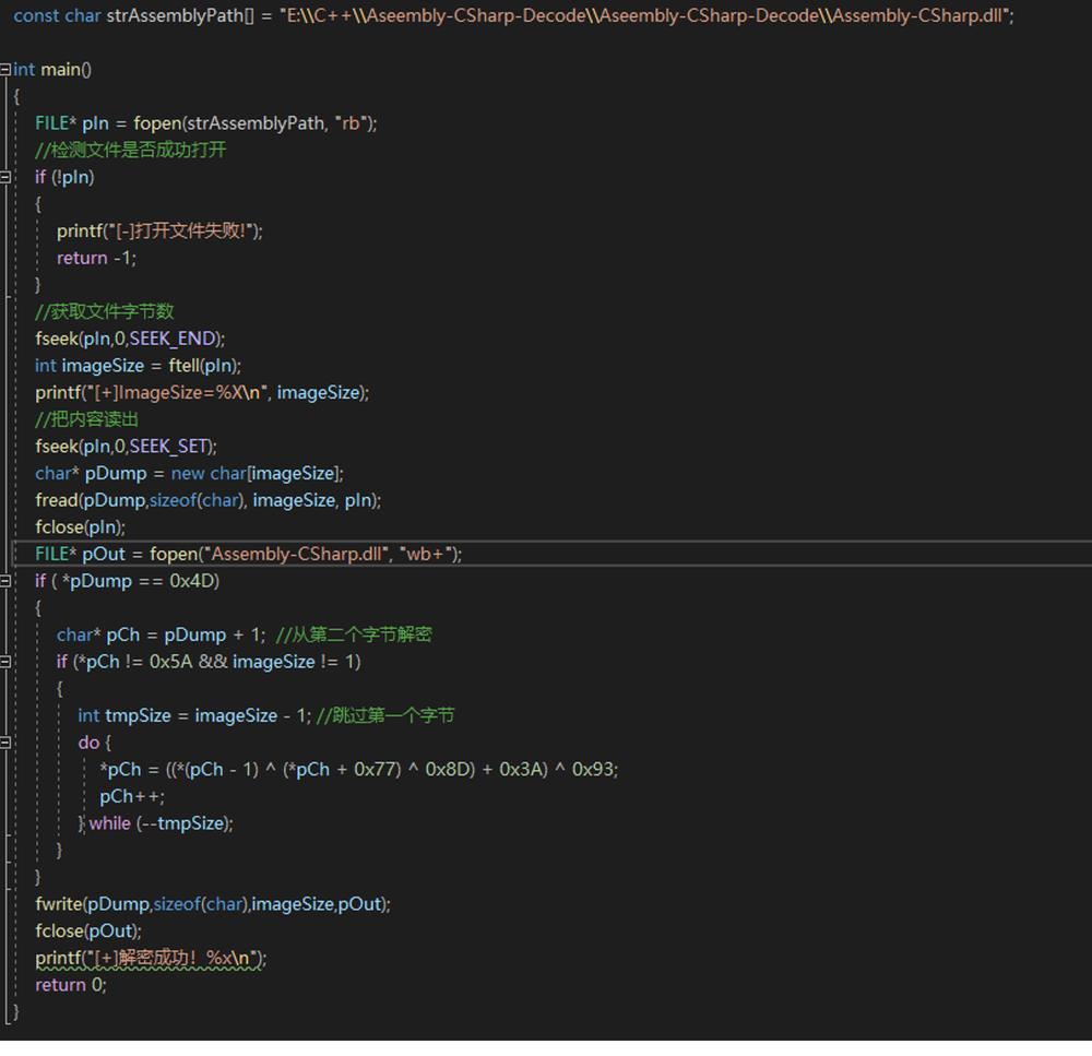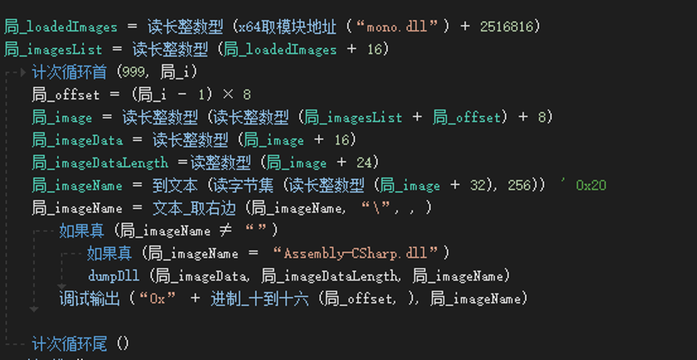 看不懂没关系,我们只需要关注他的data,data_len,name这三个参数,这三个分别表示当前被加载模块的二进制内容,二进制长度,模块名。大部分游戏厂商都会在这里判断模块名是否为Assembly-CSharp,然后进行二进制内容解密。那么只需要用调试工具在这个函数下段,然后在这里分析结束的位置,然后直接dump即可。这里放一下大概代码