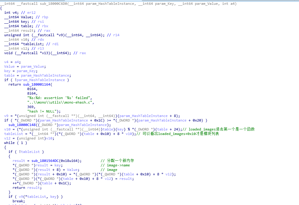 这里可以清楚的看到,U3D直接把需要的加载的模块插入了一个HashTable,然后完成模块的一个装载。这里我们先不管这个模块进行了如何加密和解密,既然你要扔给U3D托管,那么你不可能扔了一个加密模块的给U3D托管,除非你的U3D引擎进行了一个大规模的魔改。所以说,我们只需要找到这个HashTable,然后去遍历一下里面的模块,我们是不是就能拿到解密后的Assembly-CSharp,答案是肯定的。那么现在重点对象从 如何解密Assembly-CSharp变成了 如何使用loaded_images。