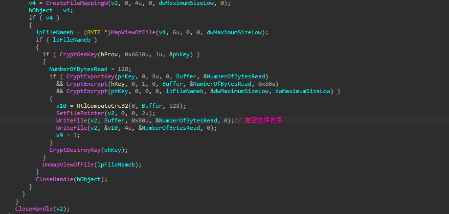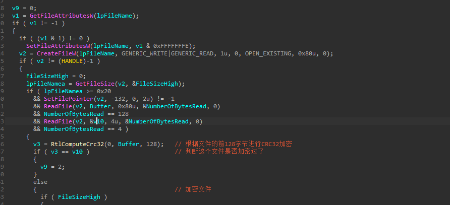 加密后的文件在文件的头部会存在一个CRC32的值,该值由原文件前128个字节计算来的。样本会判断前面这个CRC32的值来判断是否需要加密。