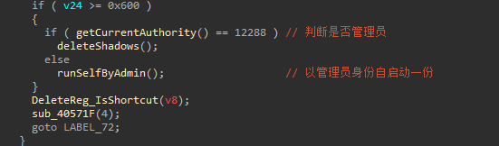 该样本在运行之初会判断是否为管理员运行,如果不是管理员,会以管理员模式运行,并关闭当前进程。