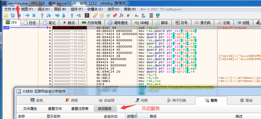 service.exe —–[CreateProcessW]——->svchost.exe——-[LoadLibrary]——–>服务启动