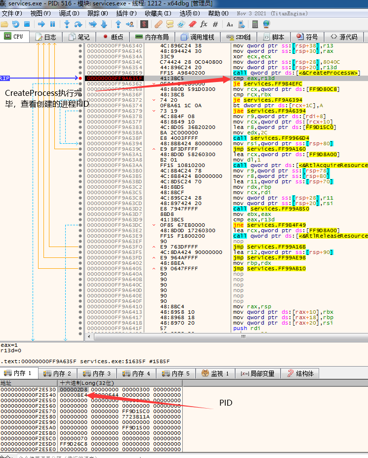 恢复线程,然后F9让调试器跑起来。这个时候这里是不会断下的,需要到第一个调试器F9,一直F9到第二个调试器断下。(这里猜测是因为services.exe的操作没跑完,然后svchost.exe单独跑就出现问题。)