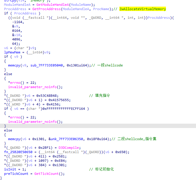 调用ZwAllocateVirtualMemory申请一段可执行内存后,开始将两段shellcode写入。