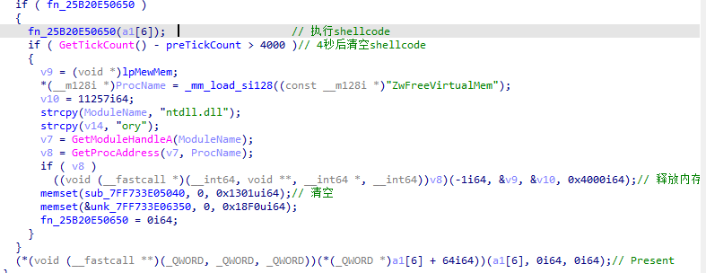 紧接着可以看到通过调用GetTickCount来判断运行时间是否超过4秒,若超过4秒则清空shellcode,即绘制消失。