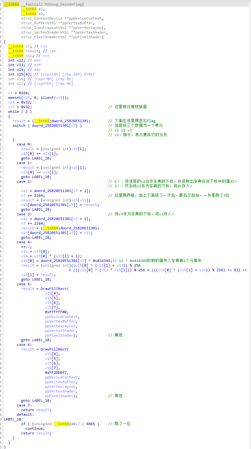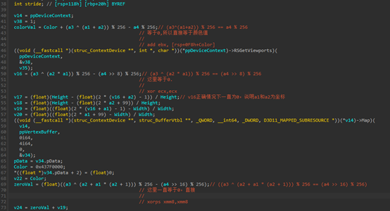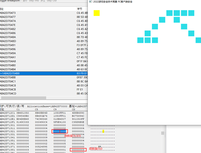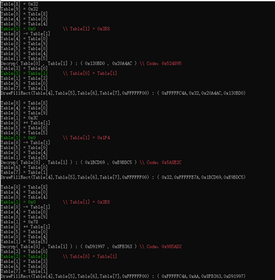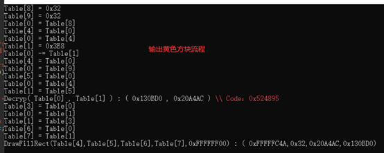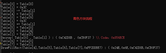 进一步分析DrawFillRect函数,得知前四个参数中,第一第二个为坐标数据,第三第四个为Key。并且在捕获绘制青色方块的数据时发现,第三和第四个参数在参与运算时结果始终为0,反之,黄色方块不为0。
