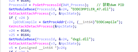 然后获取D3DCompile函数地址用作后面修复,获取dxgi.dll后面用作HOOK。
