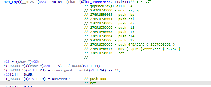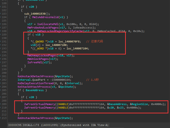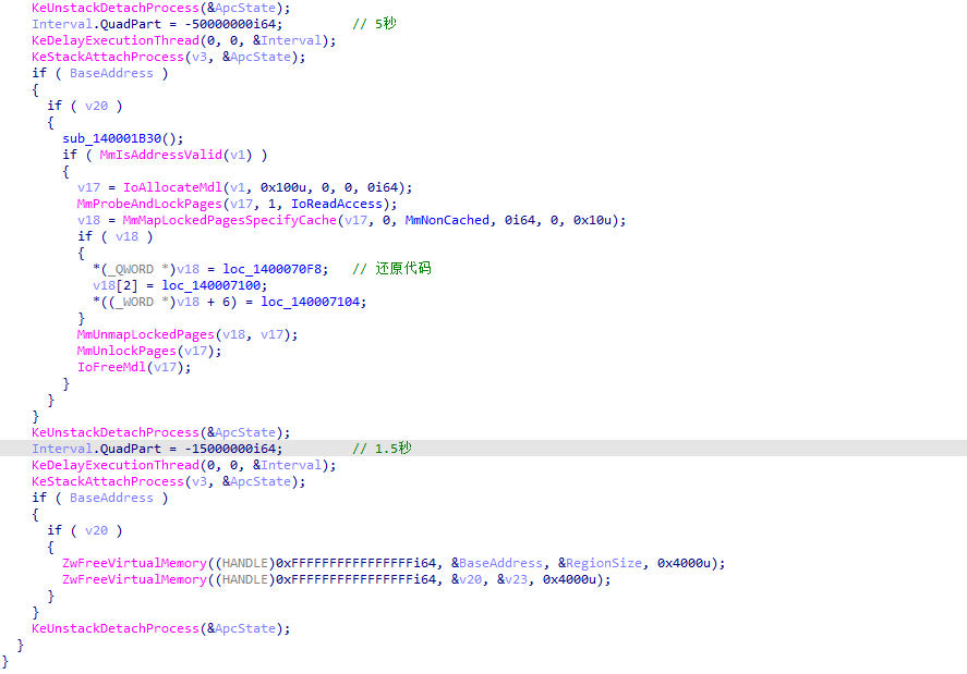 然后延迟5秒后,还原hook,并且1.5秒后将shellcode清空。