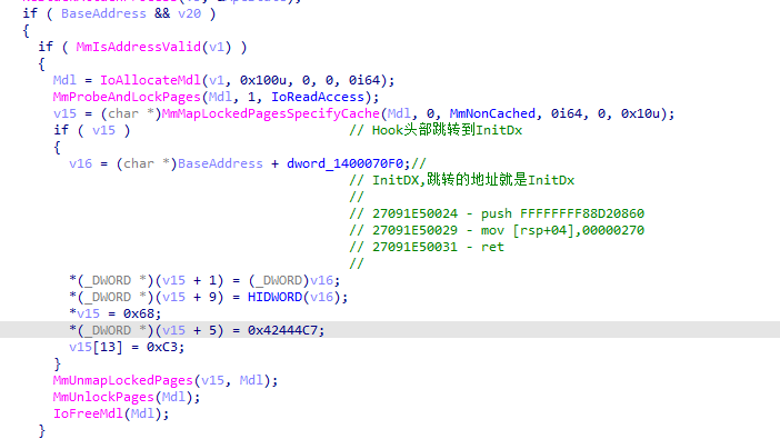 MDL映射Hook点内存并对其修改,即跳转到shellcode入口。