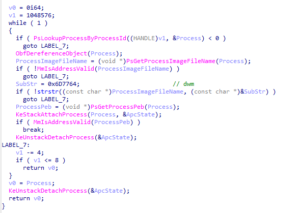 很明显将初赛的部分代码通过驱动来写。首先是获取DWM的EPROCESS。