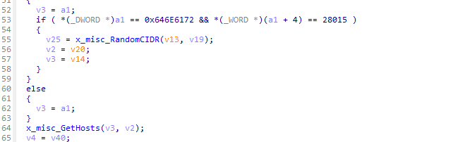 二、详细分析 1、样本分析 样本(8F56AEB3D516E6DEB858A73DA66E1071)运行后随机选择一个无类域间路由(CIDR is also used for,of bits in the address.))块在攻击期间扫描网络,它针对该 CIDR 范围内的所有 IP 地址。威胁行为者选择 CIDR 块扫描作为访问网络中不同 IP 上的各种目标主机的一种方式,而不是使用单个 IP 地址作为目标。