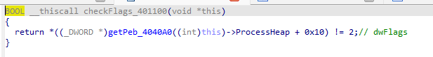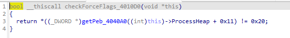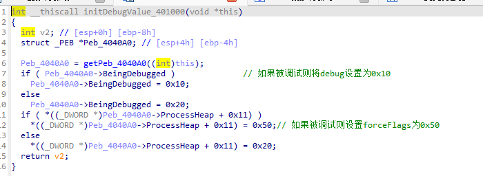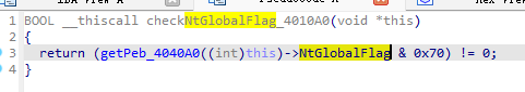 然后对PEB->ProcessHeap->Flags、PEB->ProcessHeap->ForceFlag、PEB->BeginDebug、PEB->NtGlobalFlag多个标志位进行检查是否存在调试。