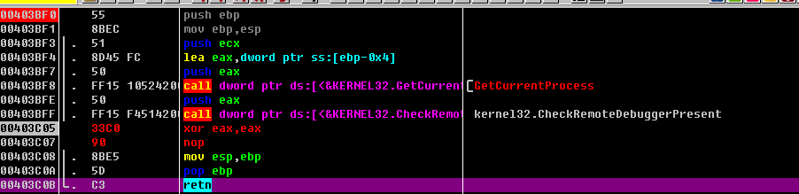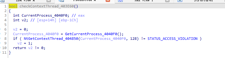 - 通过传递非法指针地址引发0xC0000005 异常,如果执行后返回的异常码不正确则表明调试器接管了异常处理,即存在调试。