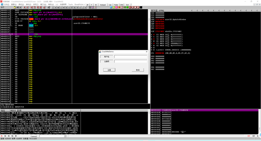 发现当用户名和注册码输入长度较长时,点击注册有输出,但该输出并非正确的注册码。猜测上层有对注册逻辑处理,交叉引用后发现上层代码无法进行伪代码生成。
