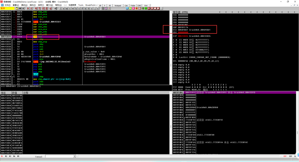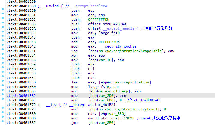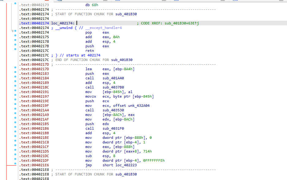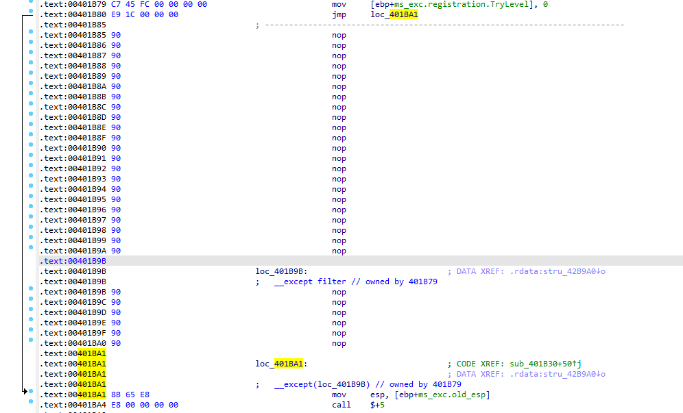 在异常地址0x401B86和异常函数0x0415890下断点后Shift+F9跳转到自定义异常跟踪分析后,发现该处最终的跳转结果为0x401BA1。