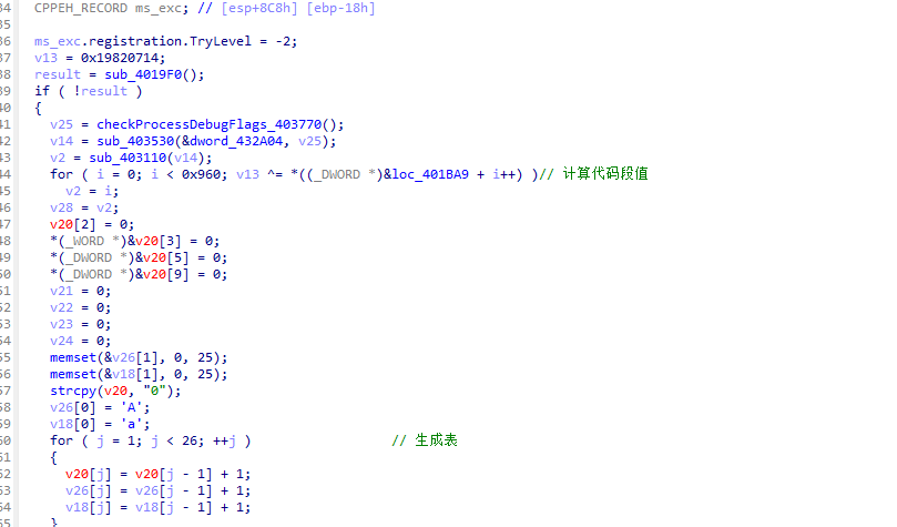 简单分析后发现该段代码存在异常处理和花指令。
