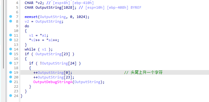 计算完毕后会执行函数OutputDebugStringA将计算出来的注册码输出,但输出的方式为将计算出的注册码的头和尾字符各上升一个字符,及”0”->”1”。