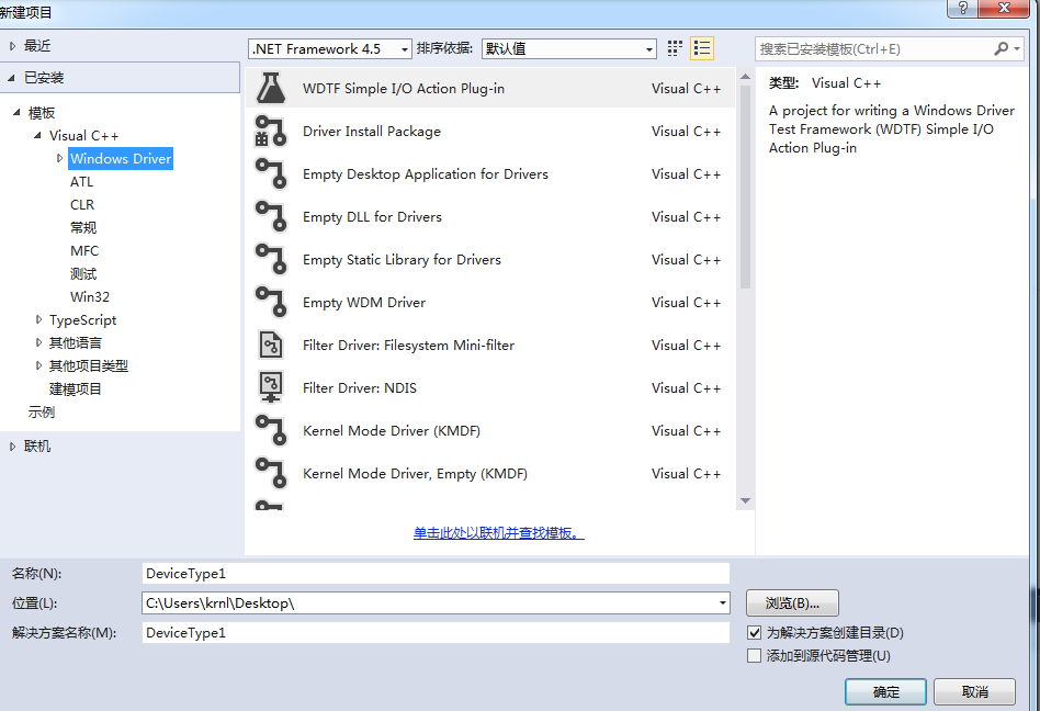 安装WDK后,VS新建项目中会多出Windows Driver项。