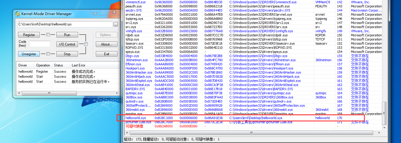 然后编译即可。在测试平台上使用KmdManager进行加载,首先点击Register,然后点击Run。使用PcHunter可以看到驱动已经加载。
