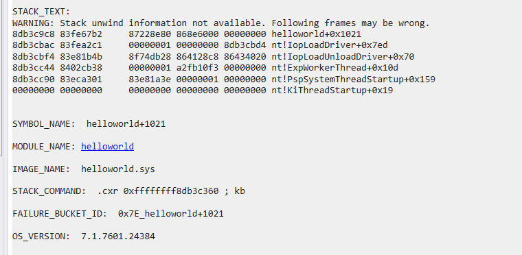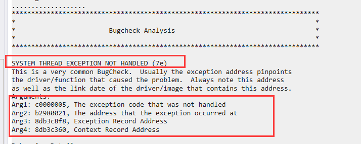 当产生蓝屏时可以通过执行!analyze -v来获取详细信息。大概流程为: