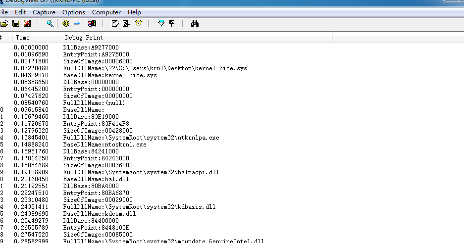 加载驱动,使用DbgView捕获输出Capture->Cpature Kernel,Capture->Enable Verbose Kernel Output