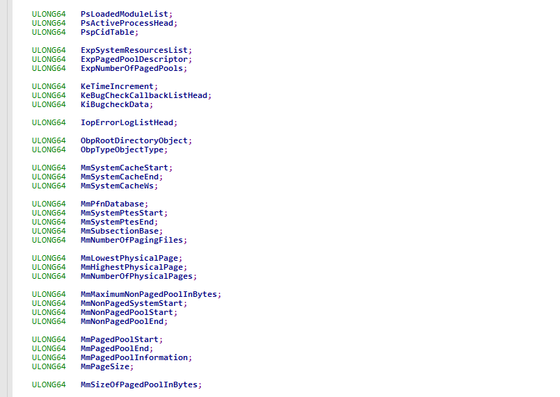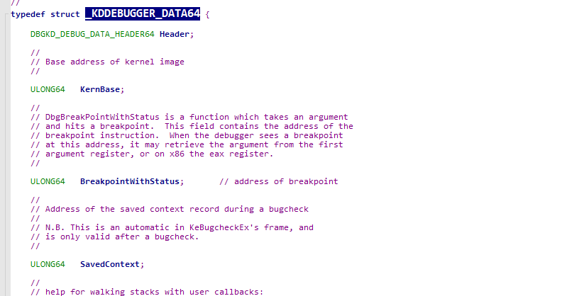 typedef struct _DBGKD_GET_VERSION64 { USHORT MajorVersion; USHORT MinorVersion; UCHAR ProtocolVersion; UCHAR KdSecondaryVersion; USHORT Flags; USHORT MachineType; UCHAR MaxPacketType; UCHAR MaxStateChange; UCHAR MaxManipulate; UCHAR Simulation; USHORT Unused[1]; ULONGLONG KernBase; ULONGLONG PsLoadedModuleList; ULONGLONG DebuggerDataList; }DBGKD_GET_VERSION64, *PDBGKD_GET_VERSION64;