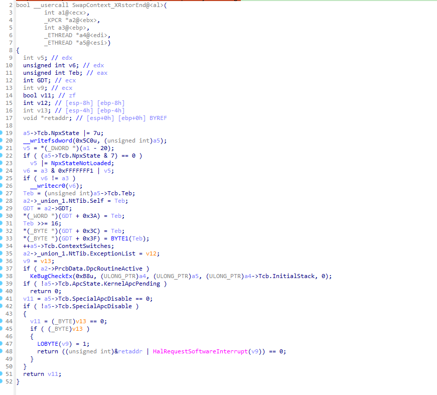 | struct _KTHREAD { struct _DISPATCHER_HEADER Header; volatile ULONGLONG CycleTime; volatile ULONG HighCycleTime; ULONGLONG QuantumTarget; VOID* InitialStack; VOID* volatile StackLimit; VOID* KernelStack; ULONG ThreadLock; union _KWAIT_STATUS_REGISTER WaitRegister; volatile UCHAR Running; UCHAR Alerted[2]; union { struct { ULONG KernelStackResident:1; ULONG ReadyTransition:1; ULONG ProcessReadyQueue:1; ULONG WaitNext:1; ULONG SystemAffinityActive:1; ULONG Alertable:1; ULONG GdiFlushActive:1; ULONG UserStackWalkActive:1; ULONG ApcInterruptRequest:1; ULONG ForceDeferSchedule:1; ULONG QuantumEndMigrate:1; ULONG UmsDirectedSwitchEnable:1; ULONG TimerActive:1; ULONG SystemThread:1; ULONG Reserved:18; }; LONG MiscFlags; }; union { struct _KAPC_STATE ApcState; struct { UCHAR ApcStateFill[23]; CHAR Priority; }; }; volatile ULONG NextProcessor; volatile ULONG DeferredProcessor; ULONG ApcQueueLock; ULONG ContextSwitches; volatile UCHAR State; CHAR NpxState; UCHAR WaitIrql; CHAR WaitMode; volatile LONG WaitStatus; struct _KWAIT_BLOCK* WaitBlockList; union { struct _LIST_ENTRY WaitListEntry; struct _SINGLE_LIST_ENTRY SwapListEntry; }; struct _KQUEUE* volatile Queue; ULONG WaitTime; union { struct { SHORT KernelApcDisable; SHORT SpecialApcDisable; }; ULONG CombinedApcDisable; }; VOID* Teb; struct _KTIMER Timer; union { struct { volatile ULONG AutoAlignment:1; volatile ULONG DisableBoost:1; volatile ULONG EtwStackTraceApc1Inserted:1; volatile ULONG EtwStackTraceApc2Inserted:1; volatile ULONG CalloutActive:1; volatile ULONG ApcQueueable:1; volatile ULONG EnableStackSwap:1; volatile ULONG GuiThread:1; volatile ULONG UmsPerformingSyscall:1; volatile ULONG VdmSafe:1; volatile ULONG UmsDispatched:1; volatile ULONG ReservedFlags:21; }; volatile LONG ThreadFlags; }; VOID* ServiceTable; struct _KWAIT_BLOCK WaitBlock[4]; struct _LIST_ENTRY QueueListEntry; struct _KTRAP_FRAME* TrapFrame; VOID* FirstArgument; union { VOID* CallbackStack; ULONG CallbackDepth; }; UCHAR ApcStateIndex; CHAR BasePriority; union { CHAR PriorityDecrement; struct { UCHAR ForegroundBoost:4; UCHAR UnusualBoost:4; }; }; UCHAR Preempted; UCHAR AdjustReason; CHAR AdjustIncrement; CHAR PreviousMode; CHAR Saturation; ULONG SystemCallNumber; ULONG FreezeCount; volatile struct _GROUP_AFFINITY UserAffinity; struct _KPROCESS* Process; volatile struct _GROUP_AFFINITY Affinity; ULONG IdealProcessor; ULONG UserIdealProcessor; struct _KAPC_STATE* ApcStatePointer[2]; union { struct _KAPC_STATE SavedApcState; struct { UCHAR SavedApcStateFill[23]; UCHAR WaitReason; }; }; CHAR SuspendCount; CHAR Spare1; UCHAR OtherPlatformFill; VOID* volatile Win32Thread; VOID* StackBase; union { struct _KAPC SuspendApc; struct { UCHAR SuspendApcFill0[1]; UCHAR ResourceIndex; }; struct { UCHAR SuspendApcFill1[3]; UCHAR QuantumReset; }; struct { UCHAR SuspendApcFill2[4]; ULONG KernelTime; }; struct { UCHAR SuspendApcFill3[36]; struct _KPRCB* volatile WaitPrcb; }; struct { UCHAR SuspendApcFill4[40]; VOID* LegoData; }; struct { UCHAR SuspendApcFill5[47]; UCHAR LargeStack; }; }; ULONG UserTime; union { struct _KSEMAPHORE SuspendSemaphore; UCHAR SuspendSemaphorefill[20]; }; ULONG SListFaultCount; struct _LIST_ENTRY ThreadListEntry; struct _LIST_ENTRY MutantListHead; VOID* SListFaultAddress; struct _KTHREAD_COUNTERS* ThreadCounters; struct _XSTATE_SAVE* XStateSave; };