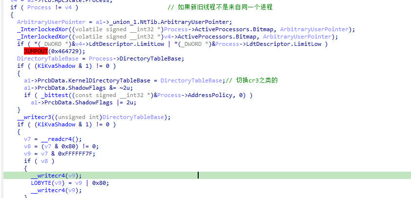 只是简单跟了一下~~~~。另外,当软件发生异常的时候(实际上就是中断),就会进行线程切换。因此,在Windows操作系统中,调用绝大部分API 以及 触发各种异常 均会导致线程的切换。如果想让自己的线程永远占有CPU,则不可以调用API、不能触发异常(内存访问也可能触发缺页异常,在用户层是看不出来的)。