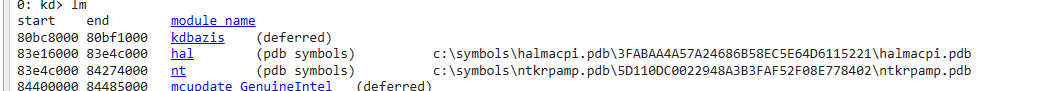 可以看到属于hal模块,因为CPU操作属于硬件操作。hal负责与硬件进行操作。Windows系统对于不同的处理器提供了不同的hal模块。在Windbg中输入命令lm查看当前Windows使用的hal模块全名称。