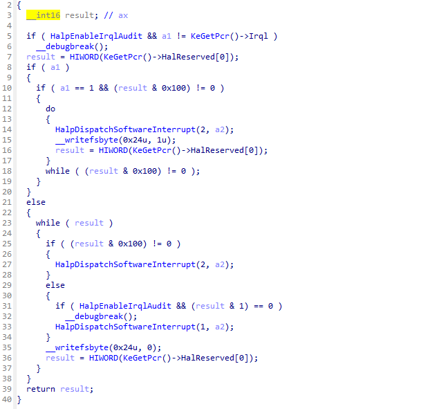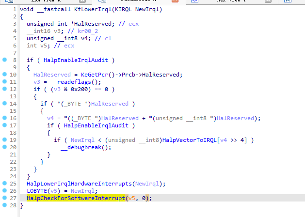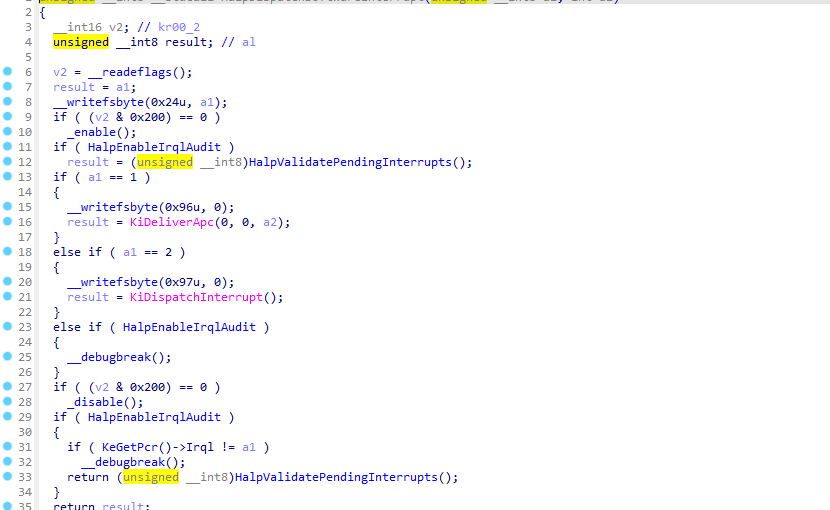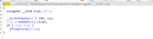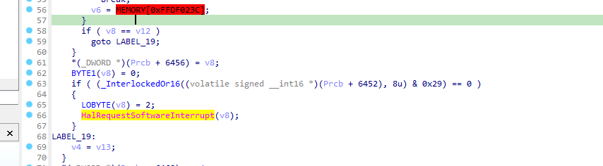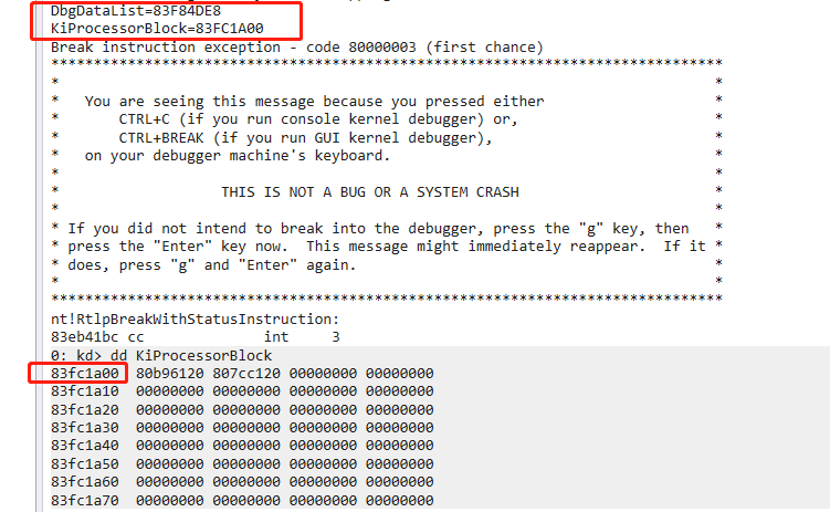 KeSetSystemAffinityThread(0); PKPCR kpcr = (PKPCR)__readfsdword(0x1C); PDBGKD_GET_VERSION64 pdbgVer = (PDBGKD_GET_VERSION64)kpcr->KdVersionBlock; ULONG_PTR DbgDataList = *(PULONG_PTR)(pdbgVer->DebuggerDataList); DbgPrint("DbgDataList=%p\n", DbgDataList); ULONG_PTR KiProcessorBlock = *(PULONG_PTR)(DbgDataList + 0x218); DbgPrint("KiProcessorBlock=%p\n", KiProcessorBlock); KeRevertToUserAffinityThread(); return STATUS_SUCCESS; }