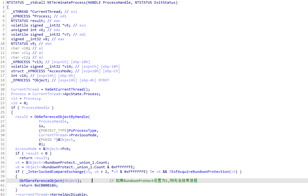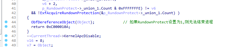 首先会判断EPROCESS.RundownProtect位,如果为1则不允许结束。这个位在上边有介绍。