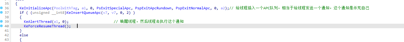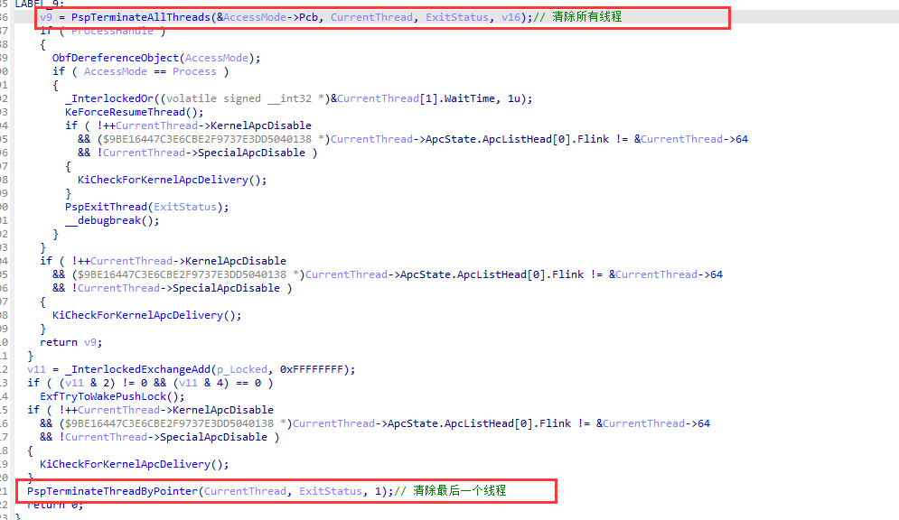 PspTerminateAllThreads中实际上就是遍历线程后调用PspTerminateThreadByPointer结束,进入PspTerminateThreadByPointer