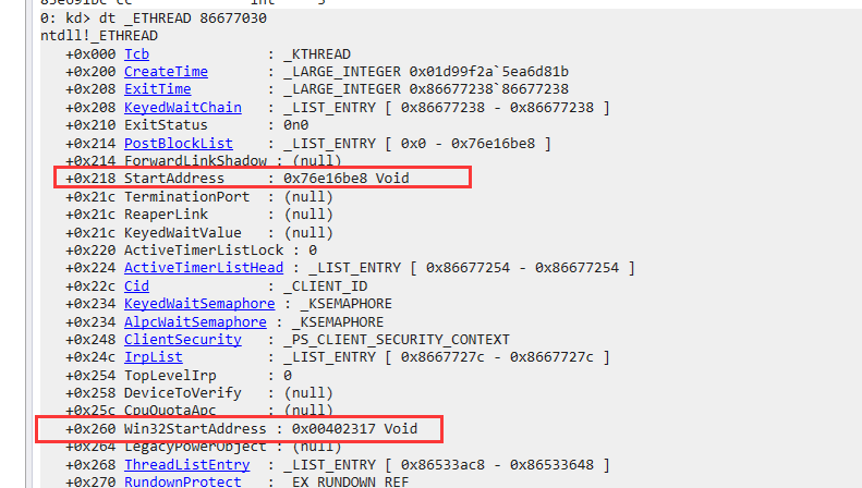 ThreadListHead:当前进程的所有线程结构体链表。这个位置- KTHREAD->ThreadListHead == KTHREAD