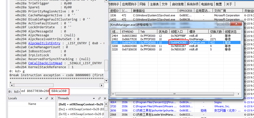 ReadyListHead:当前进程内的就绪线程链表,保存的值指向了ETHREAD->WaitListEntry地址。当进程被换出内存以后,所属的线程一旦就绪就会加入到这个链表中,然后换入进程,并将就绪线程链表全部加入全局的就绪线程链表。