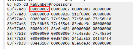 FS段,R0下叫做KPCR(内核进程控制区),R3下叫做PEB(进程环境块)。每一个核独有一个,这个结构记录了这个核的CPU信息。内核变量KeNumberProcessors用于记录当前机器有多少个核。