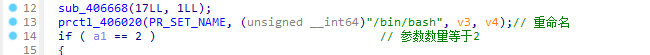 样本(00a8b3eed7356153ab93d2fd3366a60e)首先将自己的运行程序名伪装为/bin/bash,然后判断运行参数是否为2.